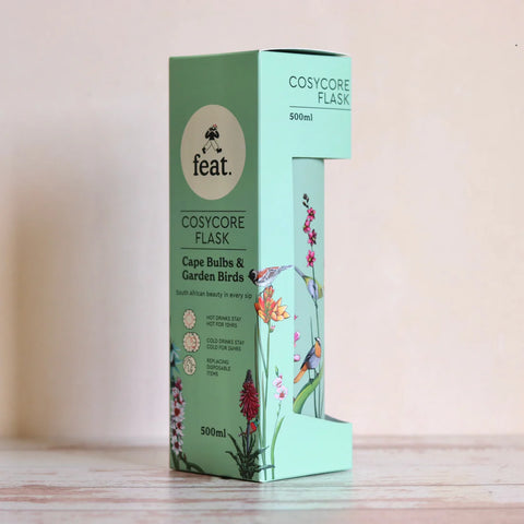 Celebrate the natural beauty of the Western Cape with our Bulbs and Birds CosyCore Flask — one of four designs featured in our first-ever range of insulated stainless steel bottles. This elegant flask showcases a curated collection of Cape bulb flowers alongside beloved garden birds, including the Cape Sparrow, Cape White-eye, Lesser Double-collared Sunbird, Cape Robin, and Chaffinch.